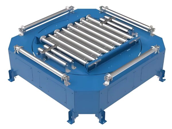 degrees, enabling them to change direction or align with other processes in the production or distribution line. It consists of a rotating platform, typically driven by a motor, and is commonly used in sorting, packaging, and assembly lines to redirect products or pallets urtherprocessingortransportationefficiently.